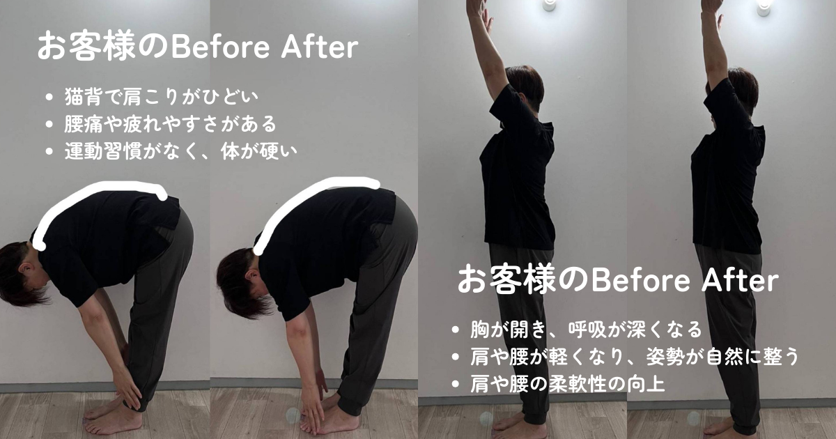 猫背や反り腰を改善するだけで、呼吸や血流の効率が上がり、体の軽さをその場で実感できます。
